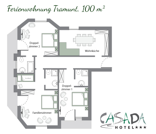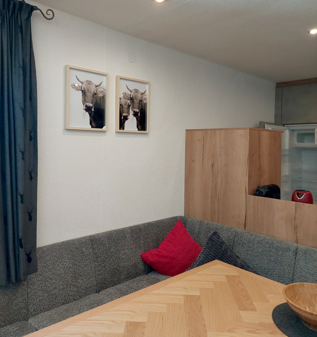 Unsere Ferienwohnung Tramunt befindet sich im 2. Obergeschoß (Aufzug vorhanden) und ist ideal für 6 Erwachsene und bis zu 2 Kinder.