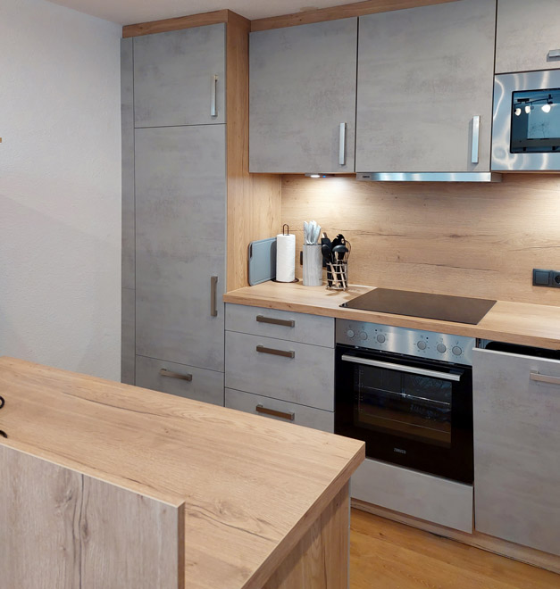 Die Wohnküche ist mit allem ausgestattet, was man braucht: Cerankochfeld, Mikrowelle, Spülmaschine, Kaffeemaschine, Kühlschrank mit Gefrierfach, Wasserkocher, Toaster, ausreichend Koch- und Speisegeschirr und natürlich Gläser & Besteck.